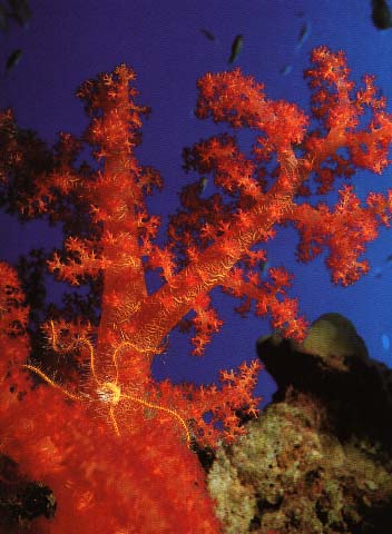 Kleine waterdiertjes heb- ben het Grote Barrière Rif gevormd. Het is zo enorm, dat het vanaf de maan te herkennen is. Het herbergt een rijkdom aan levensvormen, even kleur- rijk en veelsoortig als in het tropische regenwoud. | |
