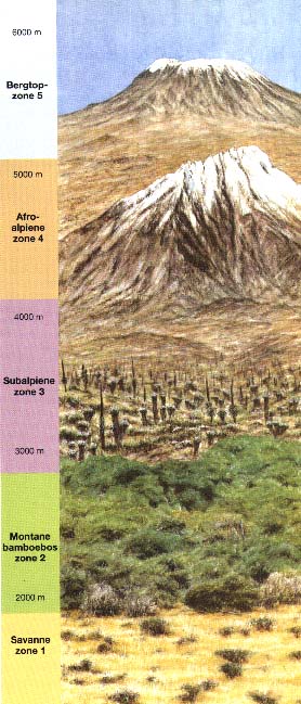 Bijzondere kenmerken van de Kilimanjaro. Hoewel de drie verschillende vulkanen al lang geleden uitdoofden, zijn ze toch als zodanig te herkennen en geven de Kilimanjaro zijn karakteristieke vorm. De hoogste top is de Kibo met 5895 meter, vormt de spits van het massief. De andere twee pieken zijn de Mawenzi (5145 meter) en de Shira (3862 meter). Het berggebied wordt in vijf verschillende zones ingedeeld die zich door hun hoogte, klimaat, vegetatie en de daar levende diersoorten van elkaar onderscheiden. |